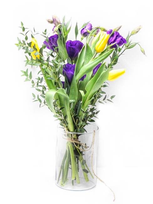 Желтые тюльпаны – это вовсе не вестники разлуки, а цветы, приносящие радость, смех и улыбки. Нежный лизиантус отражает удивительную красоту. Насыщенная, яркая зелень эвкалипта излучает приятную свежесть, удачно разбавляя цветочную композицию. В целом, такой букет светиться роскошью и энергией, передавая родным и близким теплый и пламенный привет.